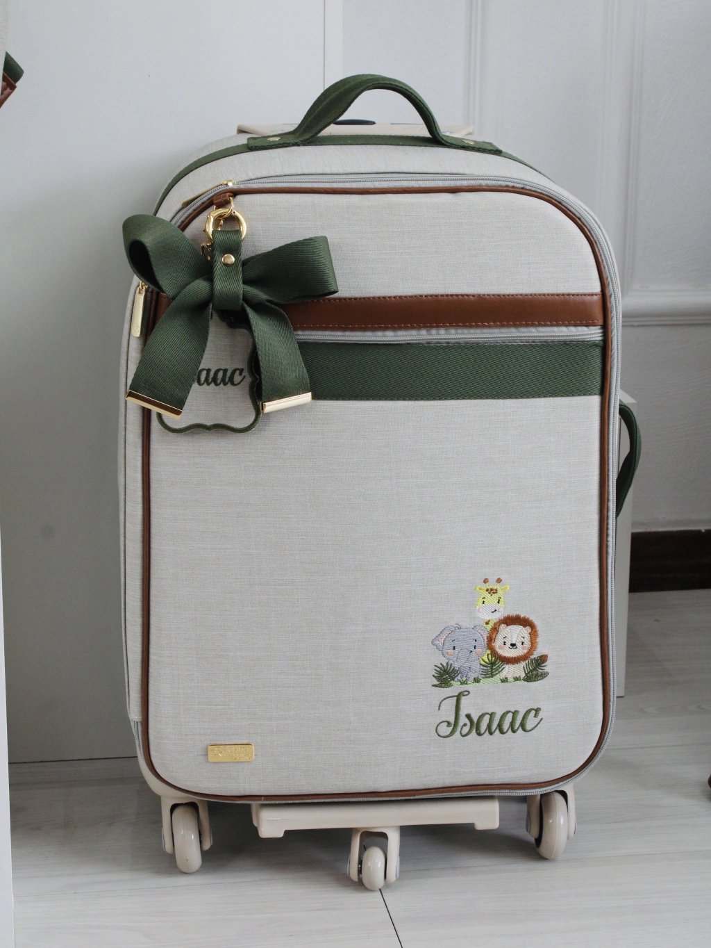 Kit feito em linho cru, acabamentos caramelo e fitas verde oliva para dar aquele charme.